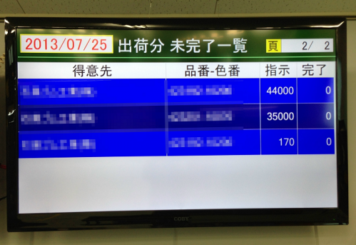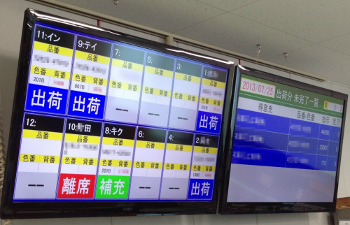 全数検査する部署にアンドンシステムを導入しました。 各検査作業の状況と出荷に対する一目で状況が分かるようにしました。 あともう一つ、時間差で社内連絡と変化点連絡が表示されます。 各検査作業台の作業状況と各得意先様への出荷状況が分かるよう、 アンドンシステムを導入しました。 しかしデカイです。55インチは… 2013/05/25 goto-mind